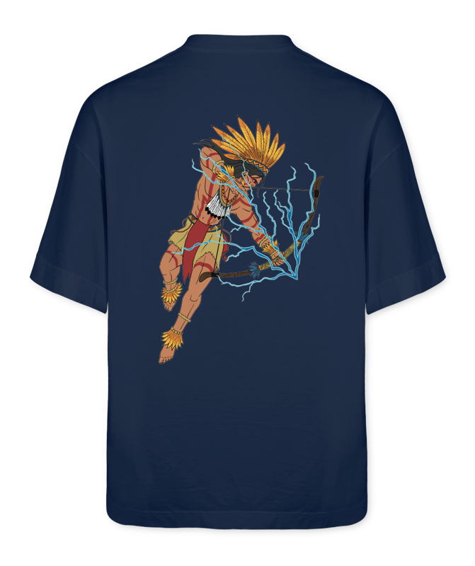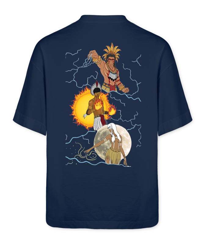 Três entidades, um só pulso. Neste casaco 100% algodão, a mitologia ganha forma, cor e presença. Ao centro, Tupã, com os braços abertos em gesto de criação. De suas mãos, raios se projetam, atravessando toda a estampa como veias de energia ancestral. À esquerda, Guaraci, de pé diante de um sol flamejante, representa a clareza, o tempo e a vigília. À direita, Jaci, envolta na luz prateada da lua, é o mistério, o sonho e a proteção noturna. “Santa Tríade” é mais do que uma estampa: é um altar vestível. Uma celebração dos ciclos da natureza, das forças que nos guiam e da memória espiritual dos povos originários. Ao vestir essa peça, você carrega consigo o sagrado: o Criador, o Sol e a Lua — a força, a luz e o mistério.
